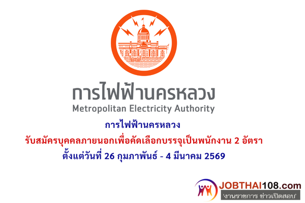 การไฟฟ้านครหลวง รับสมัครบุคคลภายนอกเพื่อคัดเลือกบรรจุเป็นพนักงาน ตั้งแต่วันที่ 26 กุมภาพันธ์ – 4 มีนาคม 2569