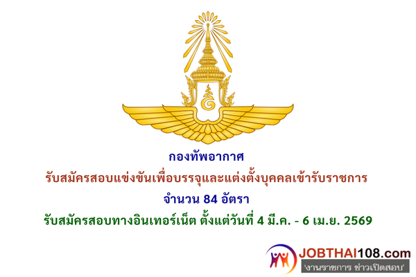 กองทัพอากาศ รับสมัครสอบแข่งขันเพื่อบรรจุและแต่งตั้งบุคคลเข้ารับราชการ จำนวน 84 อัตรา รับสมัครสอบทางอินเทอร์เน็ต ตั้งแต่วันที่ 4 มี.ค. – 6 เม.ย. 2569