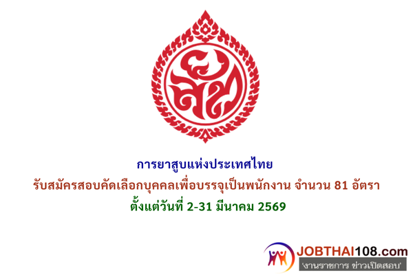 การยาสูบแห่งประเทศไทย รับสมัครสอบคัดเลือกบุคคลเพื่อบรรจุเป็นพนักงาน จำนวน 81 อัตรา ตั้งแต่วันที่ 2-31 มีนาคม 2569