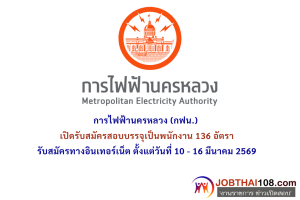 การไฟฟ้านครหลวง (กฟน.) เปิดรับสมัครสอบบรรจุเป็นพนักงาน 136 อัตรา รับสมัครทางอินเทอร์เน็ต ตั้งแต่วันที่ 10 – 16 มีนาคม 2569