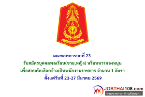 มณฑลทหารบกที่ 23 รับสมัครบุคคลพลเรือน(ชาย,หญิง) หรือทหารกองหนุนเพื่อสอบคัดเลือกจ้างเป็นพนักงานราชการ จำนวน 1 อัตรา ตั้งแต่วันที่ 23-27 มีนาคม 2569