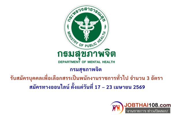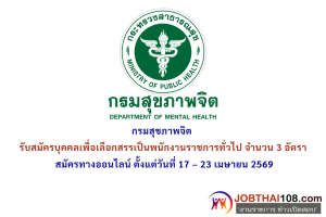 กรมสุขภาพจิต รับสมัครเลือกสรรพนักงานราชการทั่วไป ตั้งแต่วันที่ 17 – 23 เมษายน 2569