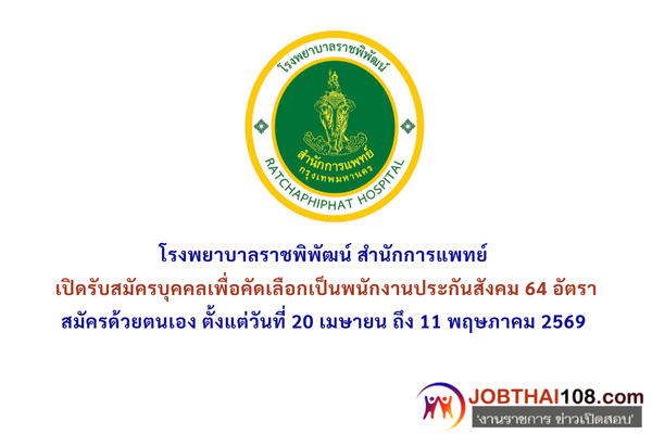 โรงพยาบาลราชพิพัฒน์ สำนักการแพทย์ เปิดรับสมัครบุคคลเพื่อคัดเลือกเป็นพนักงานประกันสังคม 64 อัตรา