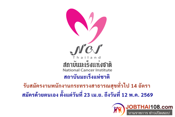 สถาบันมะเร็งแห่ชาติ รับสมัครงานพนักงานกระทรวงสาธารณสุขทั่วไป 14 อัตรา ตั้งแต่วันที่ 23 เม.ย. ถึงวันที่ 12 พ.ค. 2569