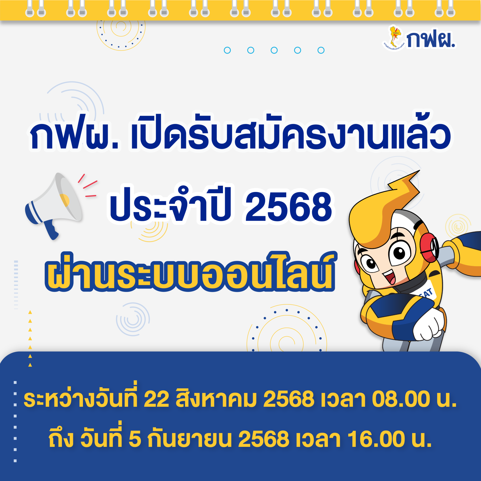 การไฟฟ้าฝ่ายผลิตแห่งประเทศไทย (กฟผ.) เปิดรับสมัครสอบบรรจุเป็นพนักงาน 500 กว่าอัตรา (ทั่วประเทศ) รับสมัครทางอินเทอร์เน็ต ตั้งแต่วันที่ 22 สิงหาคม – 5 กันยายน 2568