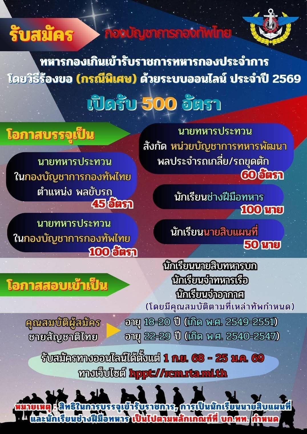 กองบัญชาการกองทัพไทย เปิดรับสมัครทหารกองเกินเข้ารับราชการทหารกองประจำการ 500 อัตรา รับสมัครทางอินเทอร์เน็ต ตั้งแต่วันที่ 1 กันยายน 2568 – 25 มกราคม 2569