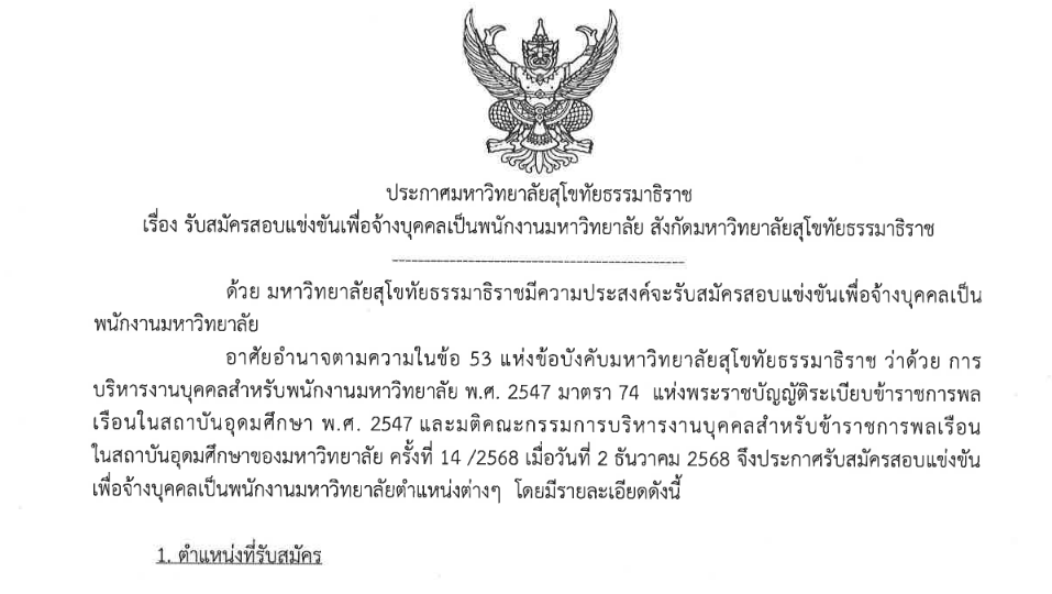 ประกาศมหาวิทยาลัยสุโขทัยธรรมาธิราช เรื่อง รับสมัครสอบแข่งขันเพื่อจ้างบุคคลเป็นพนักงานมหาวิทยาลัย สังกัดมหาวิทยาลัยสุโขทัยธรรมาธิราช