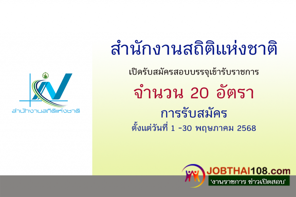 สำนักงานสถิติแห่งชาติ เปิดรับสมัครสอบแข่งขันเพื่อบรรจุและแต่งตั้งบุคคลเข้ารับราชการ 20 อัตรา สมัครทางอินเทอร์เน็ต ตั้งแต่วันที่ 1 – 30 พฤษฤษภาคม 2568