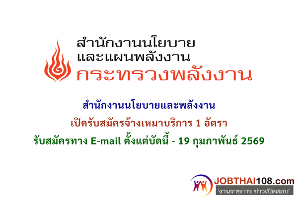 สำนักงานนโยบายและพลังงาน เปิดรับสมัครจ้างเหมาบริการ 1 อัตรา รับสมัครทาง E-mail ตั้งแต่บัดนี้ – 19 กุมภาพันธ์ 2569