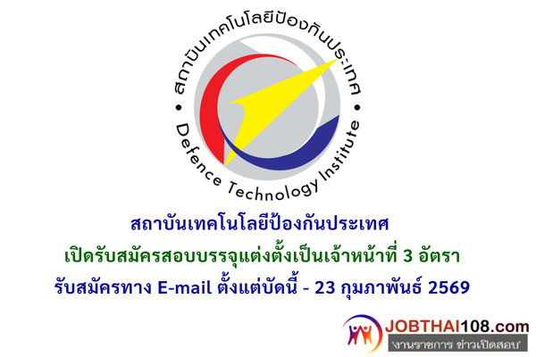 สถาบันเทคโนโลยีป้องกันประเทศ เปิดรับสมัครสอบบรรจุแต่งตั้งเป็นเจ้าหน้าที่ 3 อัตรา รับสมัครทาง E-mail ตั้งแต่บัดนี้ – 23 กุมภาพันธ์ 2569