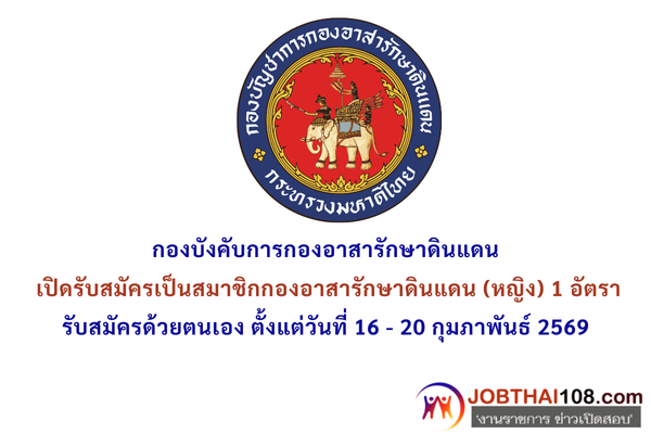 กองบังคับการกองอาสารักษาดินแดน เปิดรับสมัครเป็นสมาชิกกองอาสารักษาดินแดน (หญิง) 1 อัตรา รับสมัครด้วยตนเอง ตั้งแต่วันที่ 16 – 20 กุมภาพันธ์ 2569