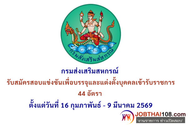 กรมส่งเสริมสหกรณ์ รับสมัครสอบแข่งขันเพื่อบรรจุและแต่งตั้งบุคคลเข้ารับราชการ 44 อัตรา ตั้งแต่วันที่ 16 กุมภาพันธ์ - 9 มีนาคม 2569