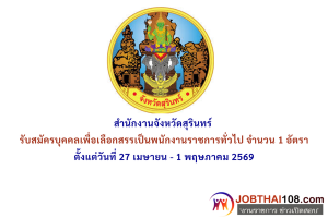สำนักงานจังหวัดสุรินทร์  รับสมัครบุคคลเพื่อเลือกสรรเป็นพนักงานราชการทั่วไป จำนวน 1 อัตรา สมัครด้วยตนเอง ตั้งแต่วันที่ 27 เมษายน – 1 พฤษภาคม 2569