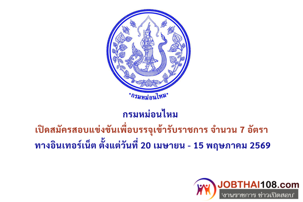 กรมหม่อนไหม เปิดสมัครสอบแข่งขันเพื่อบรรจุเข้ารับราชการ จำนวน 7 อัตรา ตั้งแต่วันที่ 20 เมษายน – 15 พฤษภาคม 2569