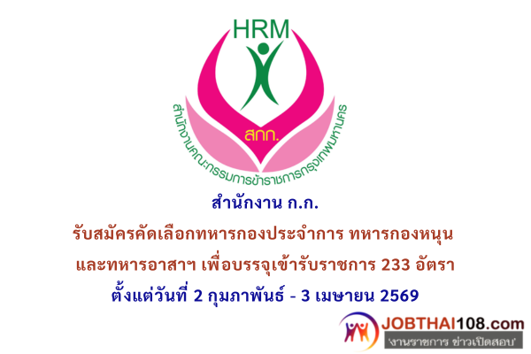 สำนักงาน ก.ก. รับสมัครคัดเลือกทหารกองประจำการ ทหารกองหนุน และทหารอาสาฯ เพื่อบรรจุเข้ารับราชการ 233 อัตรา ตั้งแต่วันที่ 2 กุมภาพันธ์ – 3 เมษายน 2569
