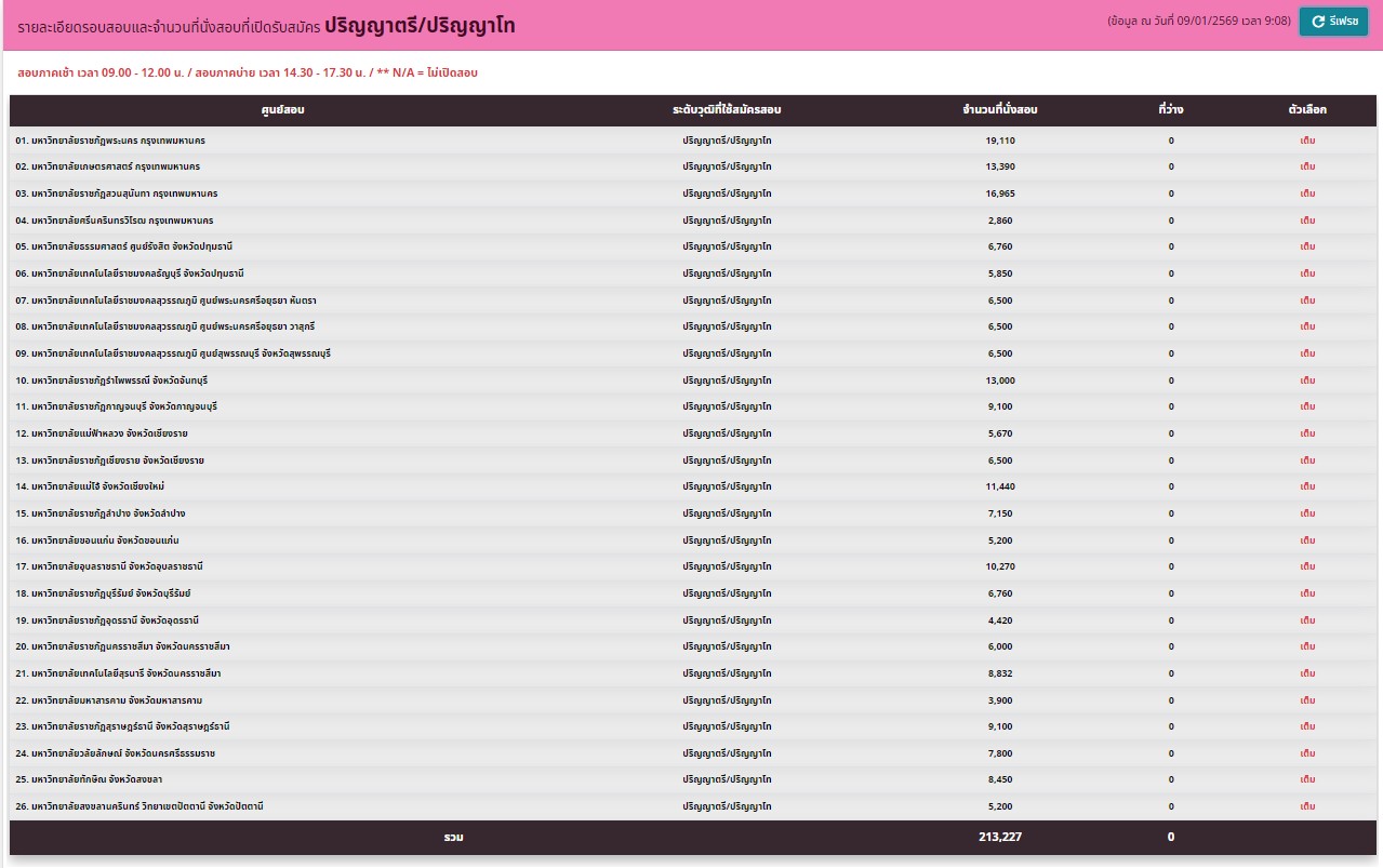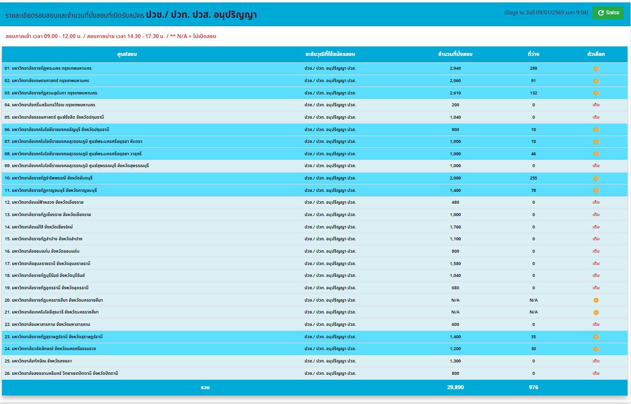 เปิดรับสมัครสอบผู้ที่สำเร็จการศึกษาแล้ว หรือผู้ที่จะสำเร็จการศึกษาในปีการศึกษา 2569 ในระดับวุฒิ ปวช. ปวท. อนุปริญญา ปวส. ปริญญาตรี หรือปริญญาโท จำนวน 26 ศูนย์สอบ รวมทั้งสิ้น 243,117 ที่นั่งสอบ ตั้งแต่วันที่ 7 มกราคม 2569 เวลา 08.30 น. (จนกว่าที่นั่งสอบจะเต็ม) กรณีไม่เต็มจำนวน จะปิดรับสมัครในวันที่ 27 มกราคม 2569 (ไม่เว้นวันหยุดราชการ)