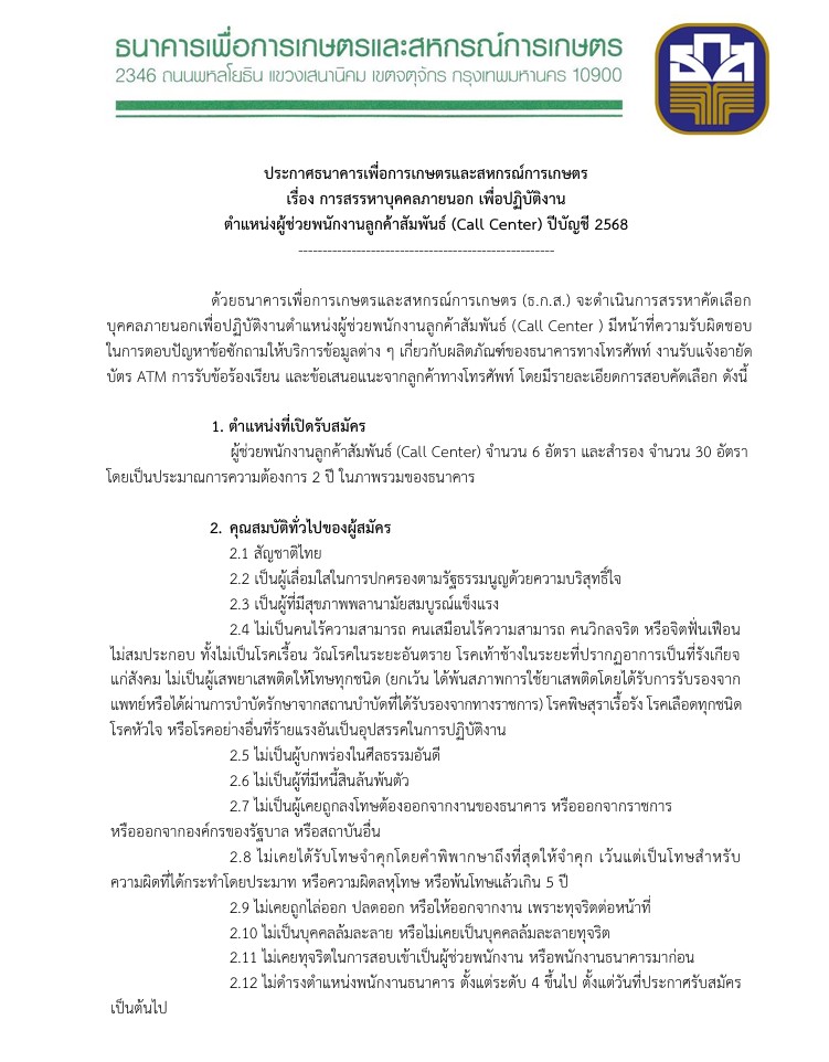 ประกาศธนาคารเพื่อการเกษตรและสหกรณ์การเกษตร เรื่อง การสรรหาบุคคลภายนอก เพื่อปฏิบัติงานตำแหน่งผู้ช่วยพนักงานลูกค้าสัมพันธ์(Call Center) ปีบัญชี 2568