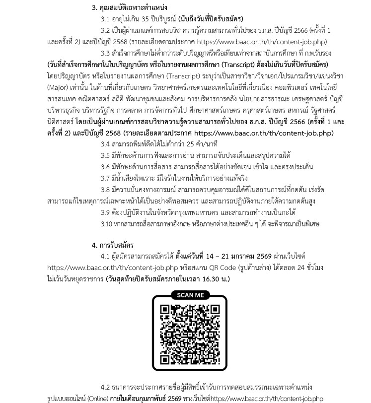 ผู้สมัครสามารถสมัครได้ ตั้งแต่วันที่ 14 – 21 มกราคม 2569 ผ่านเว็บไซต์ https://www.baac.or.th/th/content-job.php หรือสแกน QR Code (ท้ายประกาศรับสมัคร) ได้ตลอด 24 ชั่วโมง ไม่เว้นวันหยุดราชการ (วันสุดท้ายปิดรับสมัครภายในเวลา 16.30 น.)