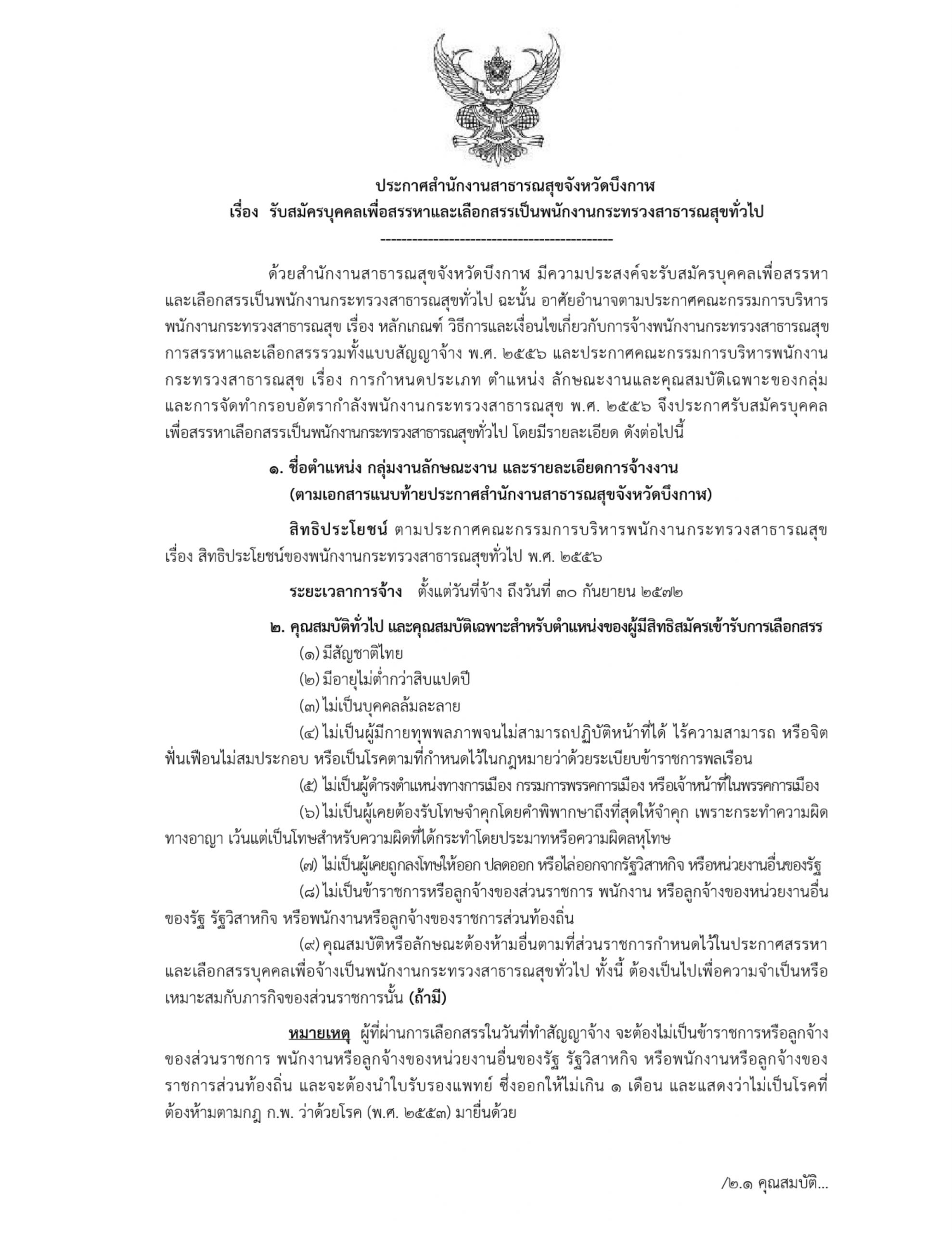 ประกาศสำนักงานสาธารณสุขจังหวัดบึงกาฬ เรื่อง รับสมัครบุคคลเพื่อสรรหาและเลือกสรรเป็นพนักงานกระทรวงสาธารณสุขทั่วไป