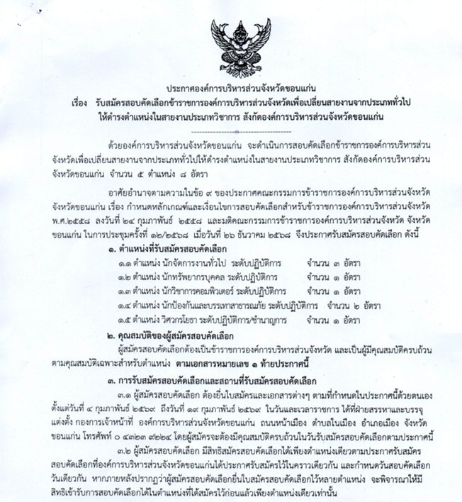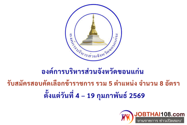 องค์การบริหารส่วนจังหวัดขอนแก่น รับสมัครสอบคัดเลือกข้าราชการ รวม 5 ตำแหน่ง จำนวน 8 อัตรา ตั้งแต่วันที่ 4 – 19 กุมภาพันธ์ 2569