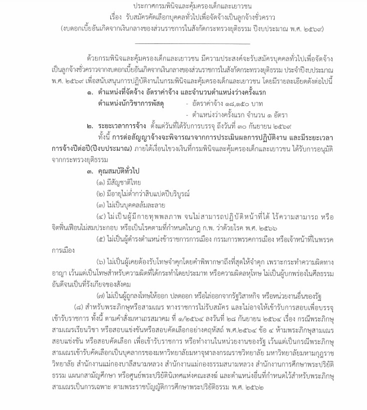 ประกาศกรมพินิจและคุ้มครองเด็กและเยาวชน เปิดรับสมัครลูกจ้างชั่วคราว (สังกัดส่วนกลาง)