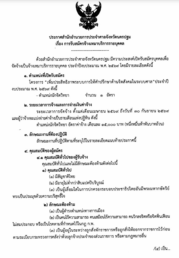 ประกาศสำนักอำนวยการประจำศาลจังหวัดนครปฐม เรื่อง การรับสมัครจ้างเหมาบริการรายบุคคล