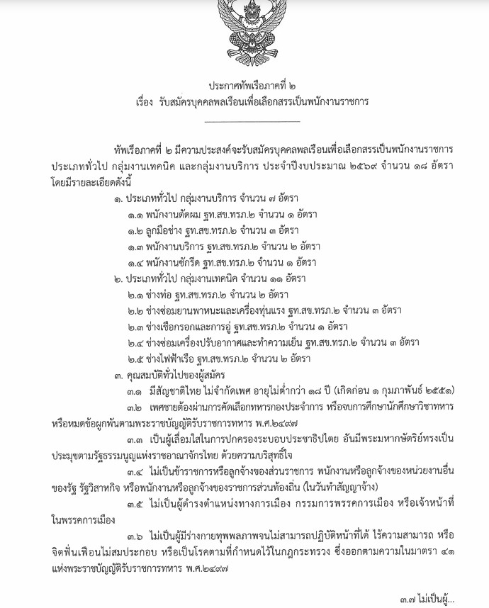 ประกาศทัพเรือภาคที่ 2 เรื่อง รับสมัครบุคคลพลเรือนเพื่อเลือกสรรเป็นพนักงานราชการ