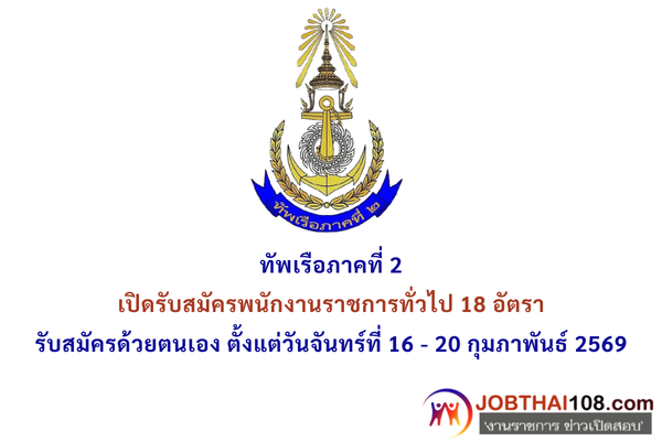 ทัพเรือภาคที่ 2 เปิดรับสมัครพนักงานราชการทั่วไป 18 อัตรา รับสมัครด้วยตนเอง ตั้งแต่วันที่ 16 – 20 กุมภาพันธ์ 2569