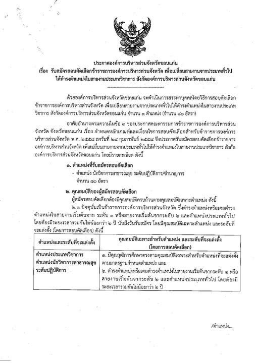 ประกาศองค์การบริหารส่วนจังหวัดขอนแก่น เรื่อง รับสมัครสอบคัดเลือกข้าราชการองค์การบริหารส่วนจังหวัด เพื่อเปลี่ยนสายงานจากประเภททั่วไป ให้ดำรงดำแหน่งในสายงานประเภทวิชาการ สังกัดองค์การบริหารส่วนจังหวัดขอนแก่น