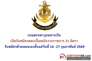 กรมสรรพาวุธทหารเรือ เปิดรับสมัครสอบเป็นพนักงานราชการ 21 อัตรา ตั้งแต่วันที่ 16 -27 กุมภาพันธ์ 2569