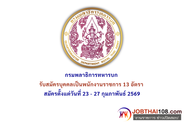กรมพลาธิการทหารบก รับสมัครบุคคลเป็นพนักงานราชการ 13 อัตรา สมัครตั้งแต่วันที่  23 – 27 กุมภาพันธ์ 2569