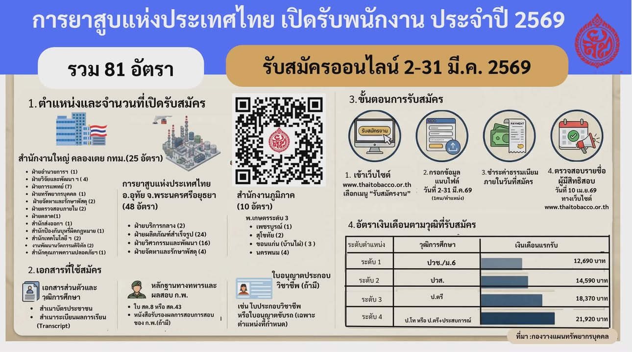 การยาสูบแห่งประเทศไทย รับสมัครสอบคัดเลือกบุคคลเพื่อบรรจุเป็นพนักงาน จำนวน 81 อัตรา ตั้งแต่วันที่ 2-31 มีนาคม 2569