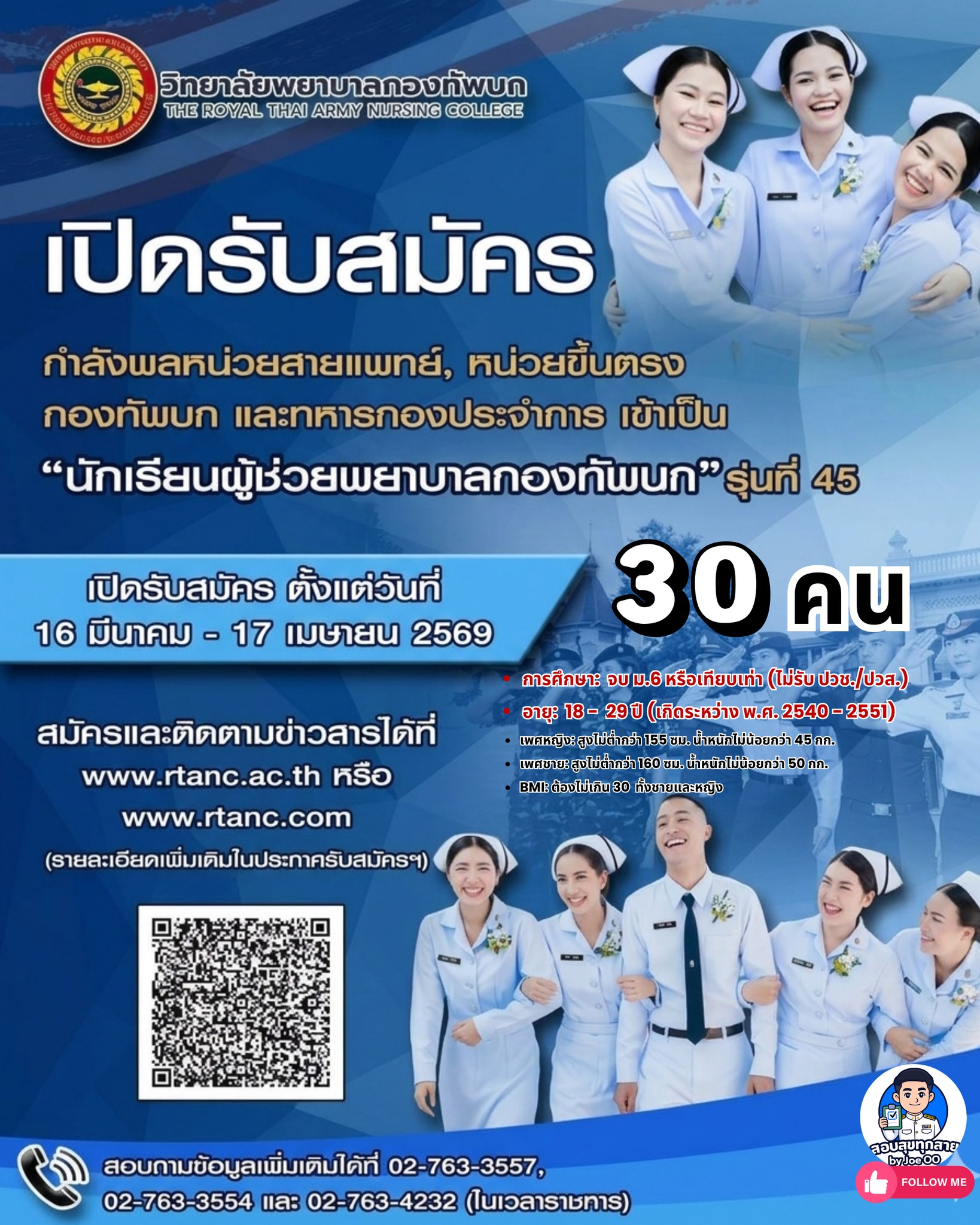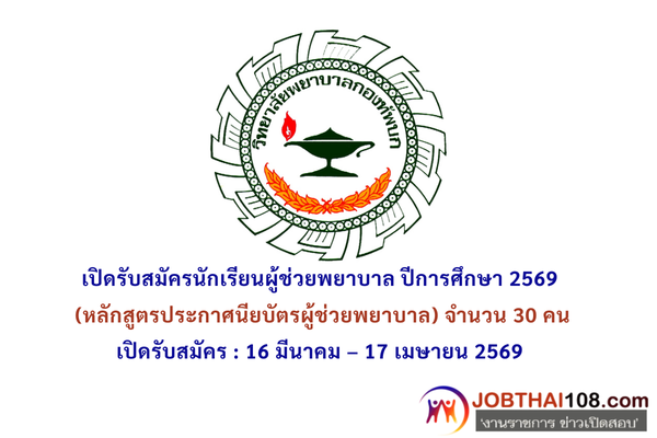 กองทัพบก โดยวิทยาลัยพยาบาลกองทัพบก เปิดรับสมัครบุคคลเข้าเป็น นักเรียนผู้ช่วยพยาบาล หลักสูตรประกาศนียบัตรผู้ช่วยพยาบาล ประจำปีการศึกษา 2569 ประเภท ทุนส่วนตัว จำนวนรับไม่เกิน 30 คน เพื่อพัฒนาบุคลากรด้านการช่วยเหลือทางการพยาบาลในสังกัดกองทัพบก