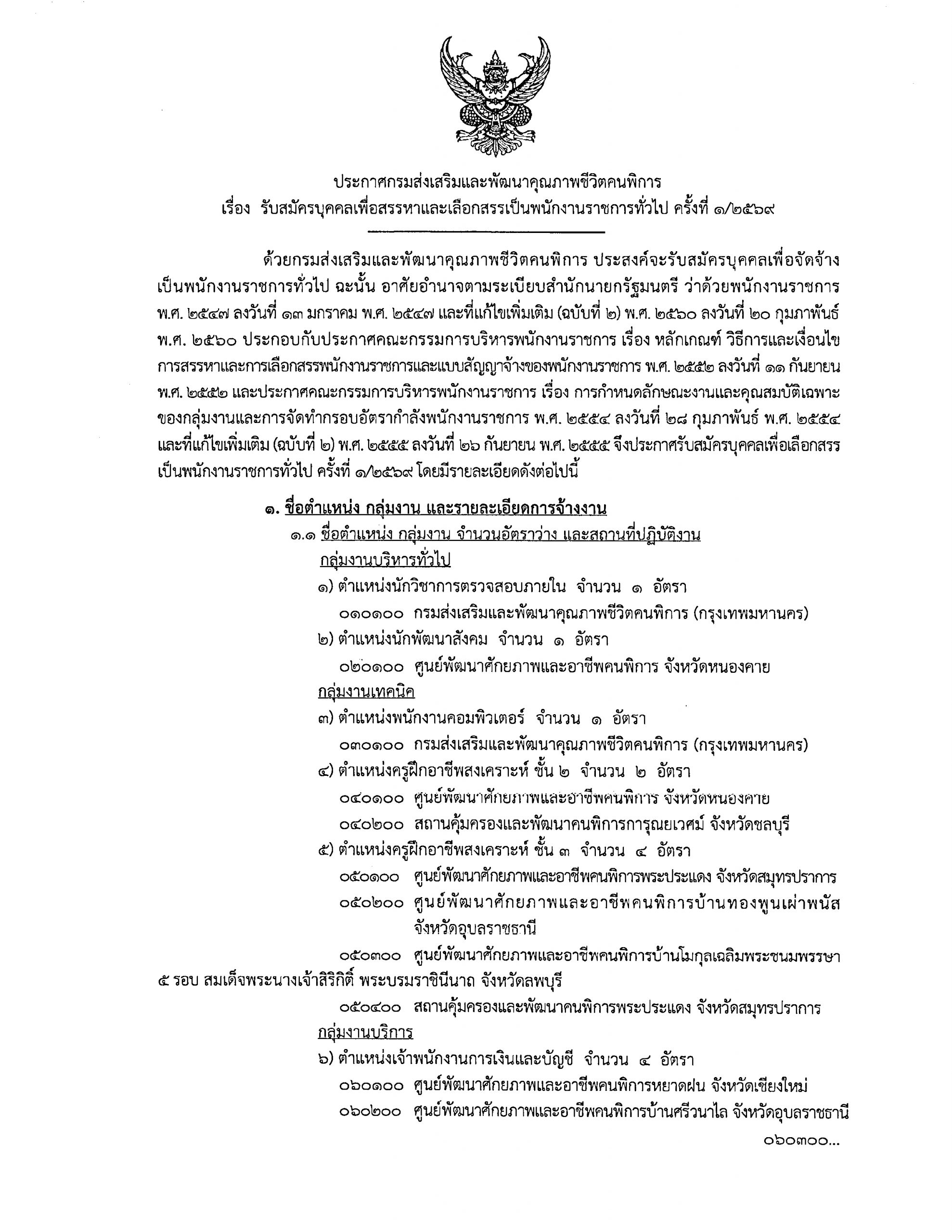 ประกาศกรมส่งเสริมและพัฒนาคุณภาพชีวิตคนพิการ เรื่อง รับสมัครบุคคลเพื่อสรรหาและเลือกสรรเป็นพนักงานราชการทั่วไป ครั้งที่ 1/2569 ด้วยกรมส่งเสริมและพัฒนาคุณภาพชีวิตคนพิการ ประสงค์จะรับสมัครบุคคลเพื่อจัดจ้างเป็นพนักงานราชการทั่วไป