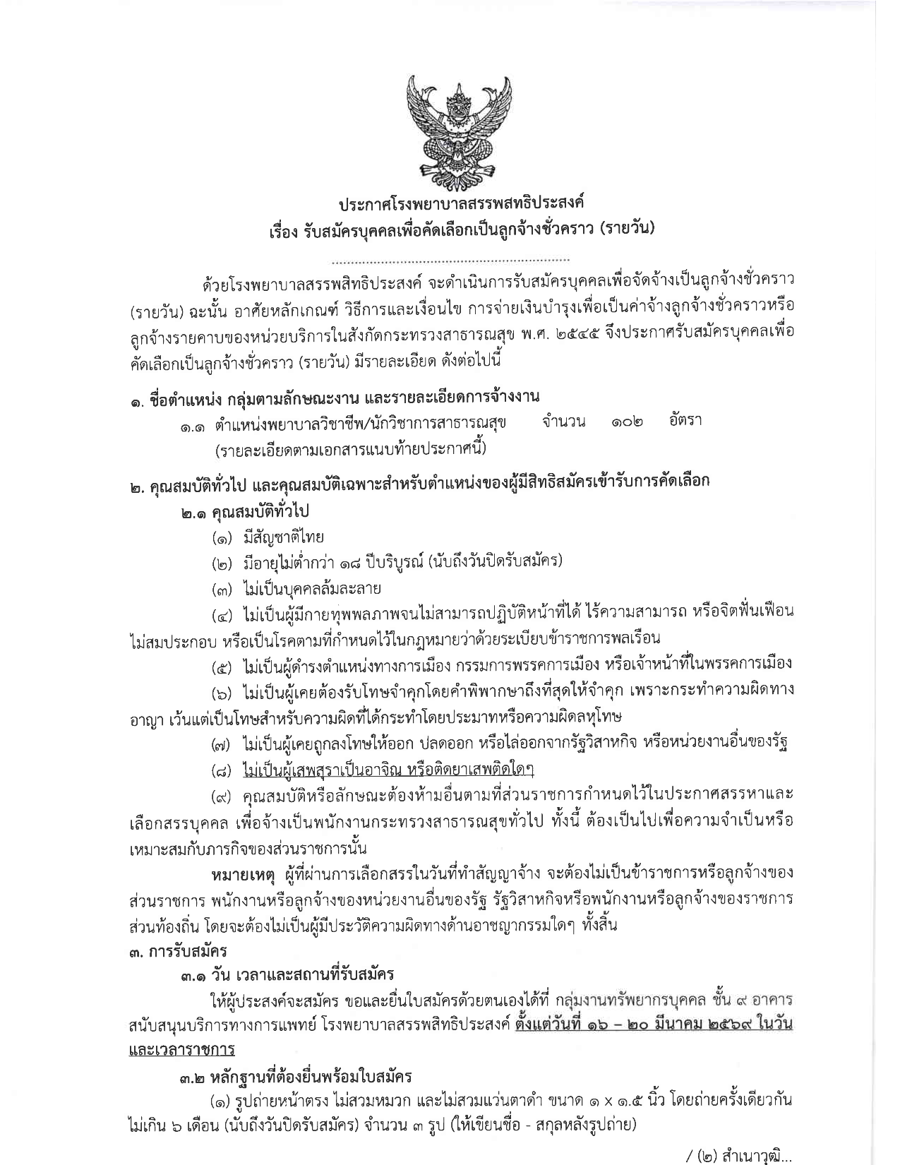 โรงพยาบาลสรรพสิทธิประสงค์ รับสมัครบุคคลเพื่อคัดเลือกเป็นลูกจ้างชั่วคราว 102 อัตรา