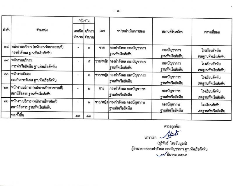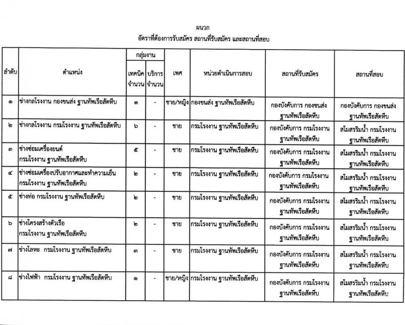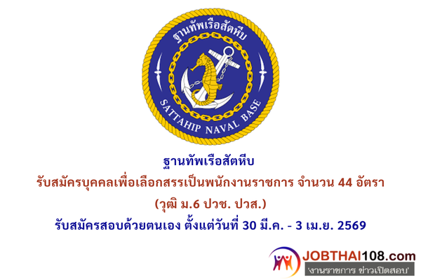 ฐานทัพเรือสัตหีบ รับสมัครบุคคลเพื่อเลือกสรรเป็นพนักงานราชการ จำนวน 44 อัตรา (วุฒิ ม.6 ปวช. ปวส.) รับสมัครสอบด้วยตนเอง ตั้งแต่วันที่ 30 มี.ค. – 3 เม.ย. 2569