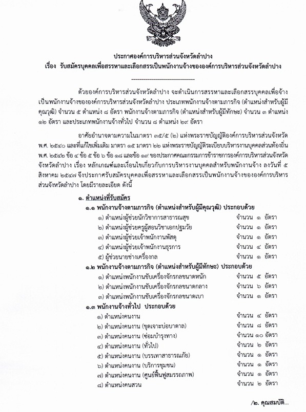 ประกาศองค์การบริหารส่วนจังหวัดลำปาง เปิดรับสมัครบุคคลเพื่อเลือกสรรเป็นพนักงานจ้าง